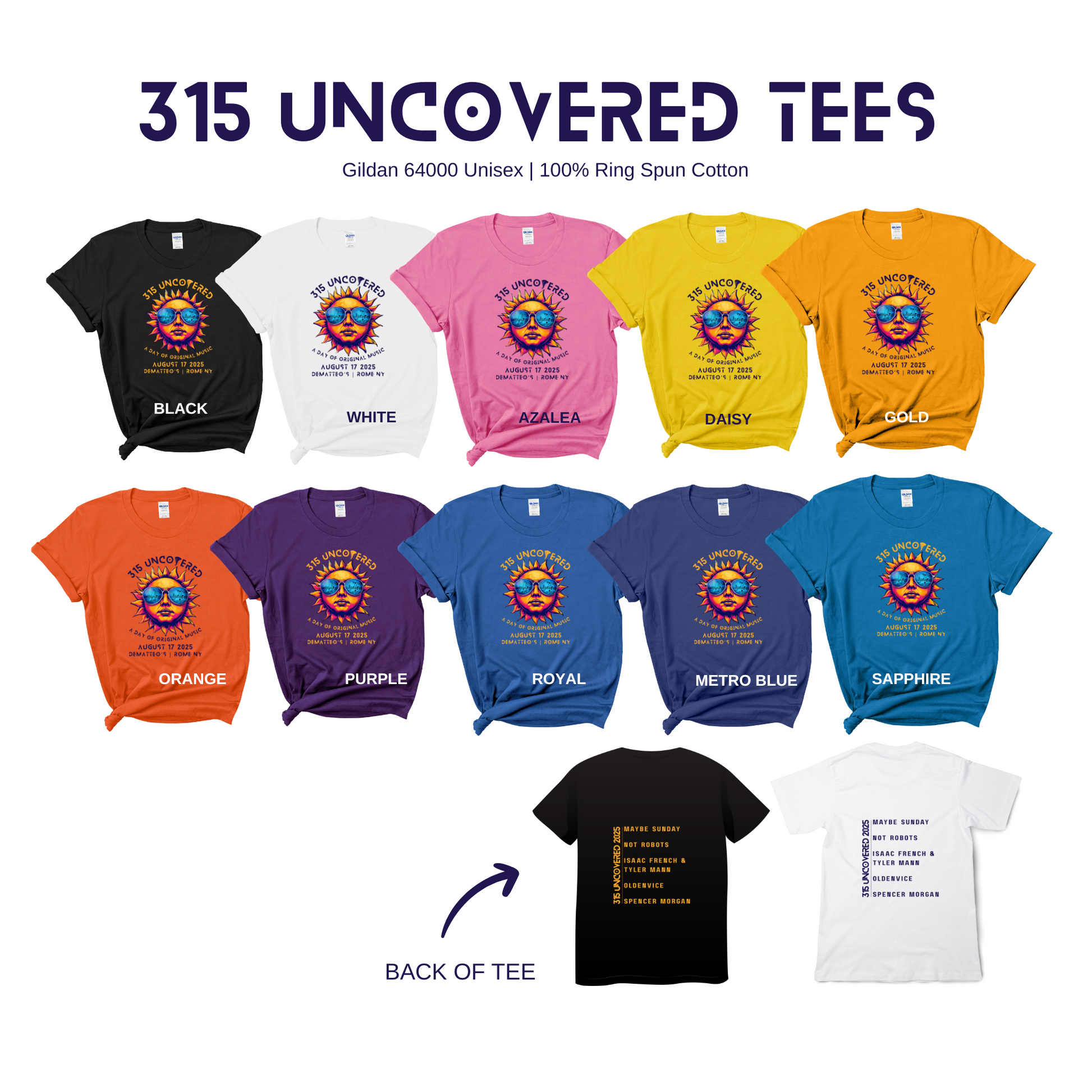 The UPDATED/RESCHEDULED Official 315 Uncovered Tee! Printed on Gildan 64000 Unisex T Shirts. 100% Ring Spun Cotton. You'll notice the V in Uncovered has been changed to a tornado as that's what cancelled the original date and the NEW date - AUGUST 17, 2025!